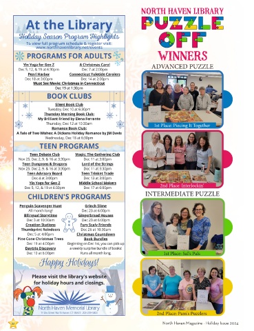 NORTH HAVEN LIBRARY WINNERS ADVANCED PUZZLE 1st Place: Piecing It Together 2nd Place: Interlockin' INTERMEDIATE PUZZLE 1st Place: Sal's Pals 2nd Place: Pam's Puzzlers 32 North Haven Magazine - Holiday Issue 2024